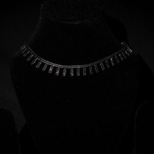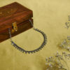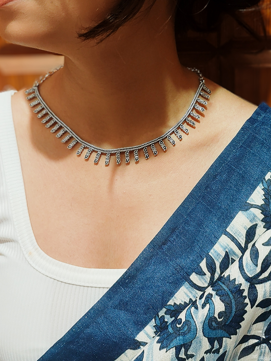 Shikha is a sleek silver neckpiece adorned with fine engraved drops, creating a graceful rhythm around the neckline. A perfect blend of simplicity and tradition, it adds an understated charm to any outfit.